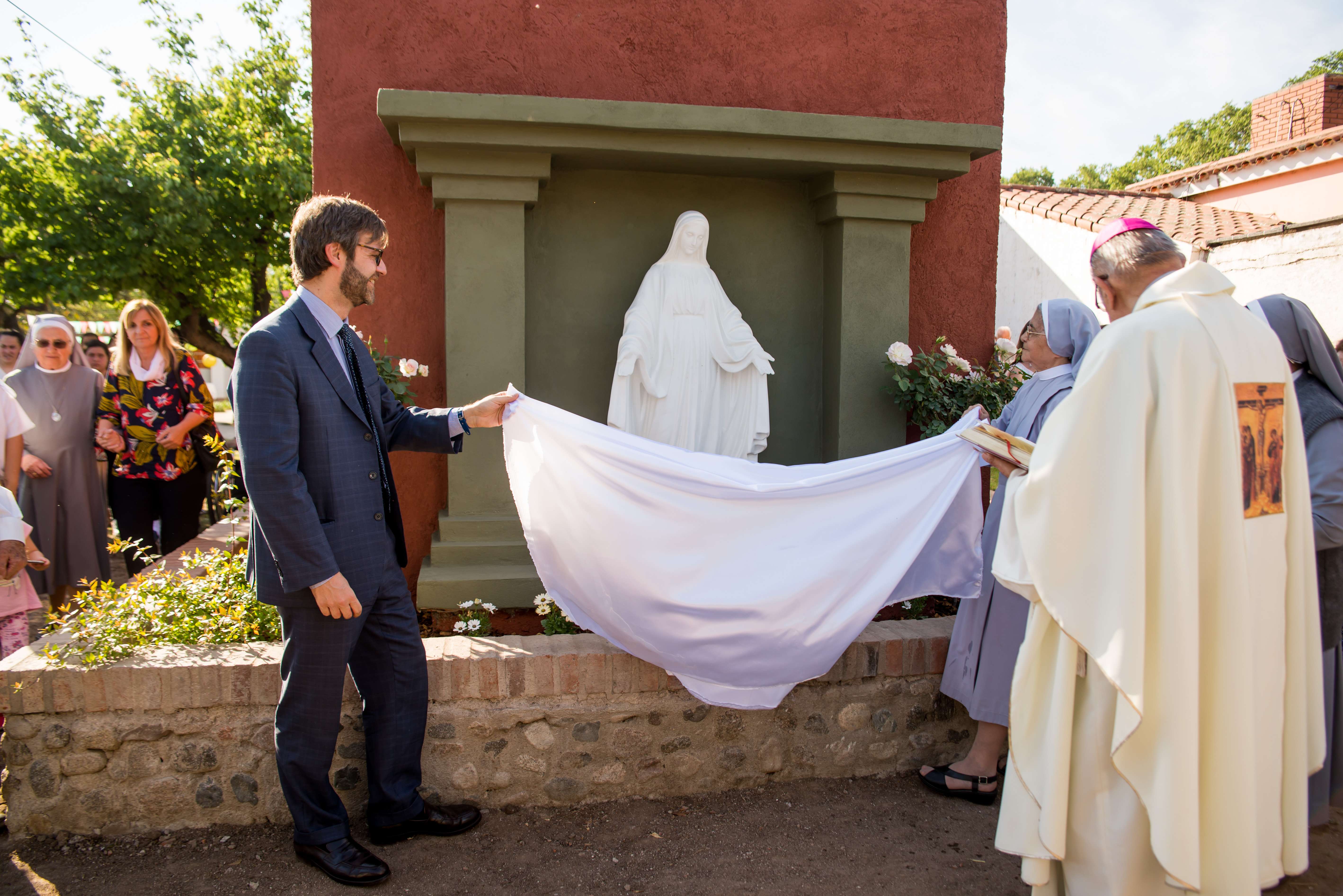 Con gran solemnidad, entronizamos la imagen de la Virgen de la Medalla Milagrosa en una de las entradas al Hogar. Monseñor Rodríguez, Obispo emérito, bendijo la imagen que fue descubierta por el Cónsul de Italia y la Hna. Elena. La Banda de música de la Gendarmería Nacional le dio un marco más solemne al acto: interpretaron el Himno de Italia, que fue cantado por algunos nonos italianos, y el Himno Argentino. Fue un momento muy emotivo, ya que se recordó a la Madre Eufrasia que, italiana como ellos, vino a esta Patria y la amó como propia, desplegando su servicio en favor de los más débiles. Enseñó a sus Hijas el valor de una vida de entrega y sacrificio por el Reino. También a ella nos encomendamos, pidiéndole que nos alcance de Dios la bendición para esta obra.
