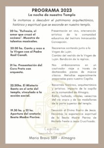 Este año, organizamos el proyecto “La noche de los Templos”, con docentes del colegio, de tres áreas curriculares afines a la muestra: Historia, Prof. Hernán Capissano, Arte, Lic. José Massimo, y Música, Prof. Dante Galeano, quienes convocaron a alumnos de distintos cursos, para participar de la muestra, en la noche del 9 de septiembre.